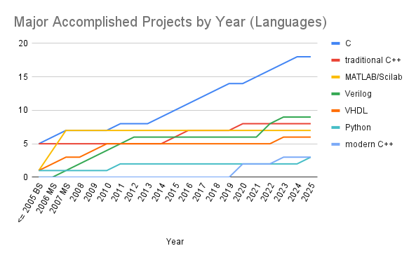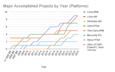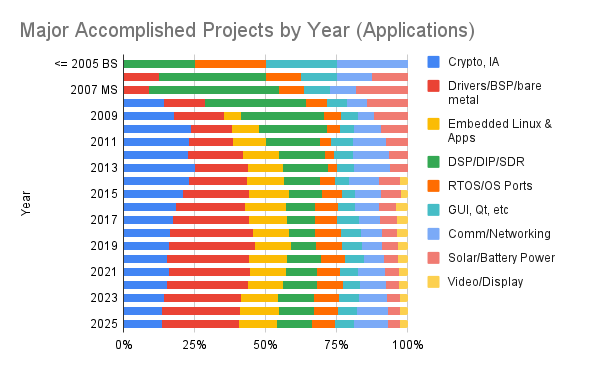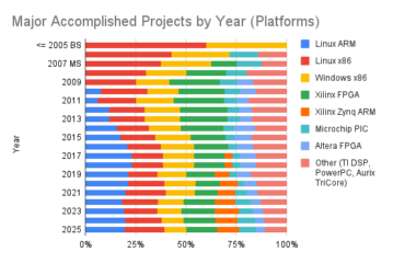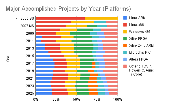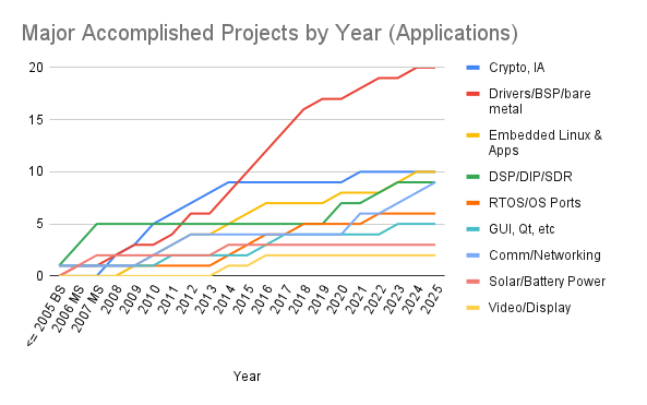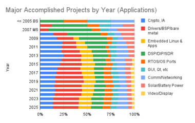 I love bare-metal work on microcontrollers or DSPs for real-time applications, and also coding high reliability RTOS systems and multi-core SoCs. I have developed everything from drivers to self-tests to applications in audio processing, motion detection, aircraft instruments, self-driving cars, and more.